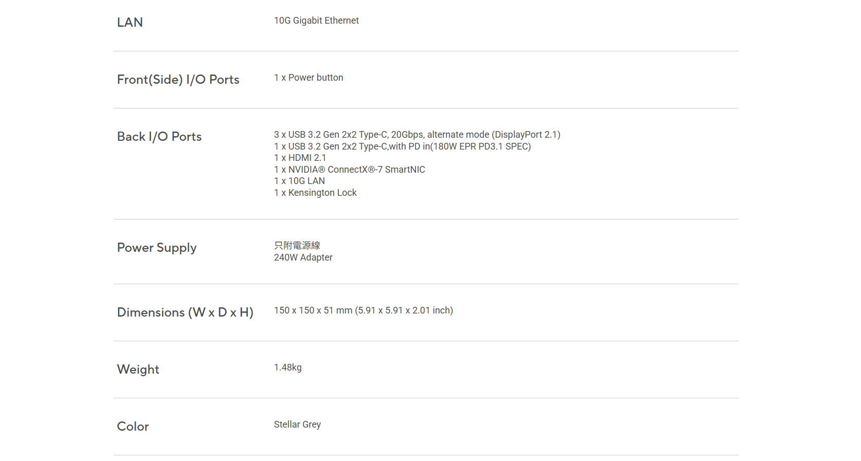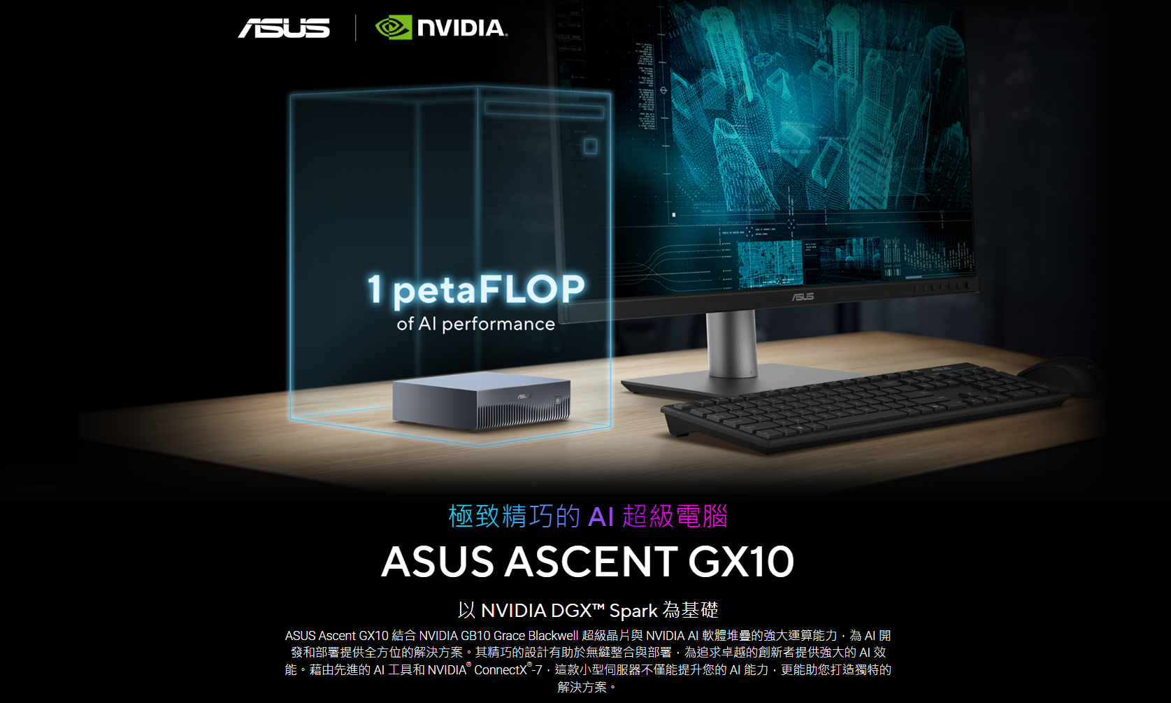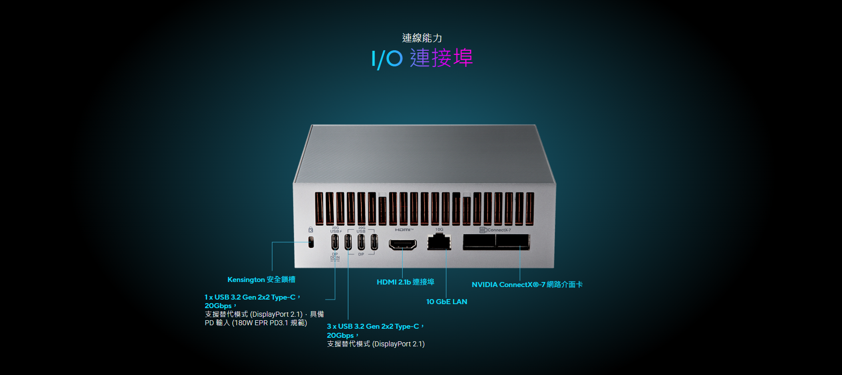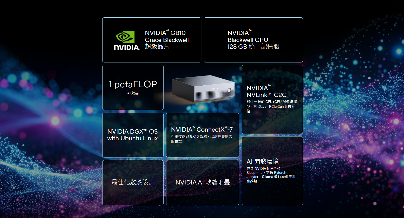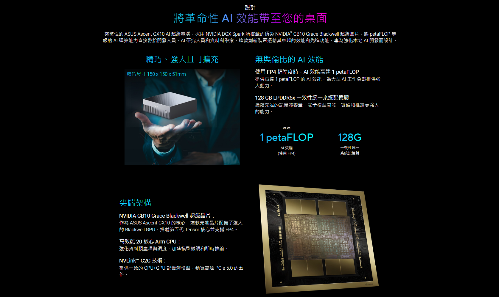 ✦ 極致 AI 效能:搭載 NVIDIA® GB10 Grace Blackwell 超級晶片,提供高達 1 petaFLOP 的 AI 運算效能,並配備 128GB 記憶體,足以支援 2000 億(200B)參數模型的微調。