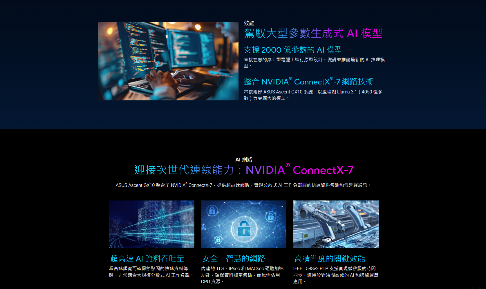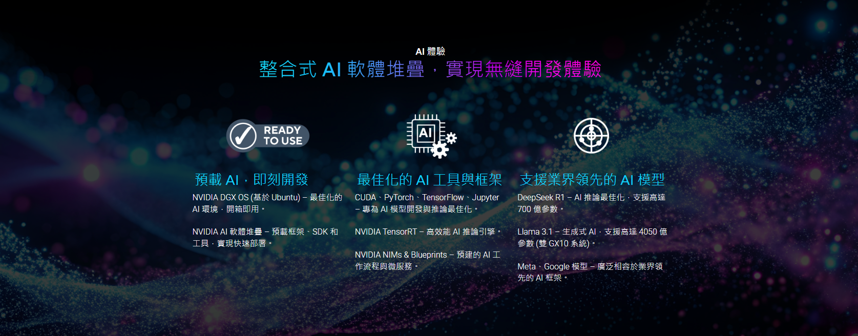 ✦ 全方位 AI 解決方案: 結合 GB10 硬體與 NVIDIA AI 軟體,為 AI 的開發及部署提供完整的一站式解決方案。