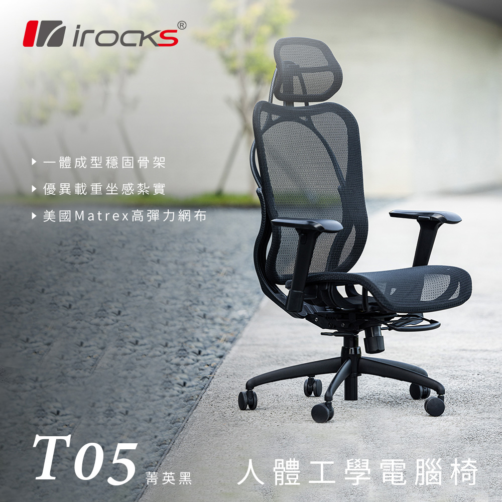 irocks T05 Plus 電競椅(黑)/人性化托盤改良/尼龍網布/可調椅背/4D/五年保