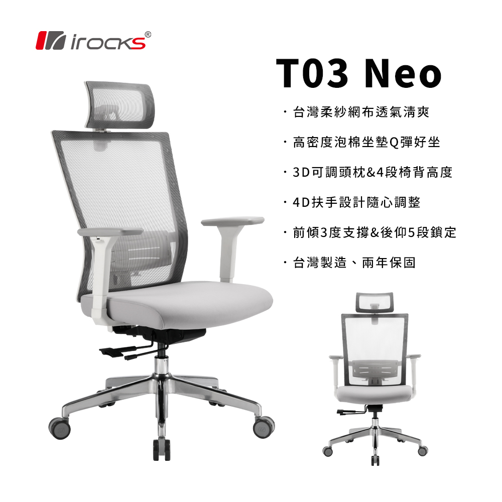 Irocks T03 Neo 電競椅(白框灰布)/高彈力網布/4D扶手/3D可調頭枕