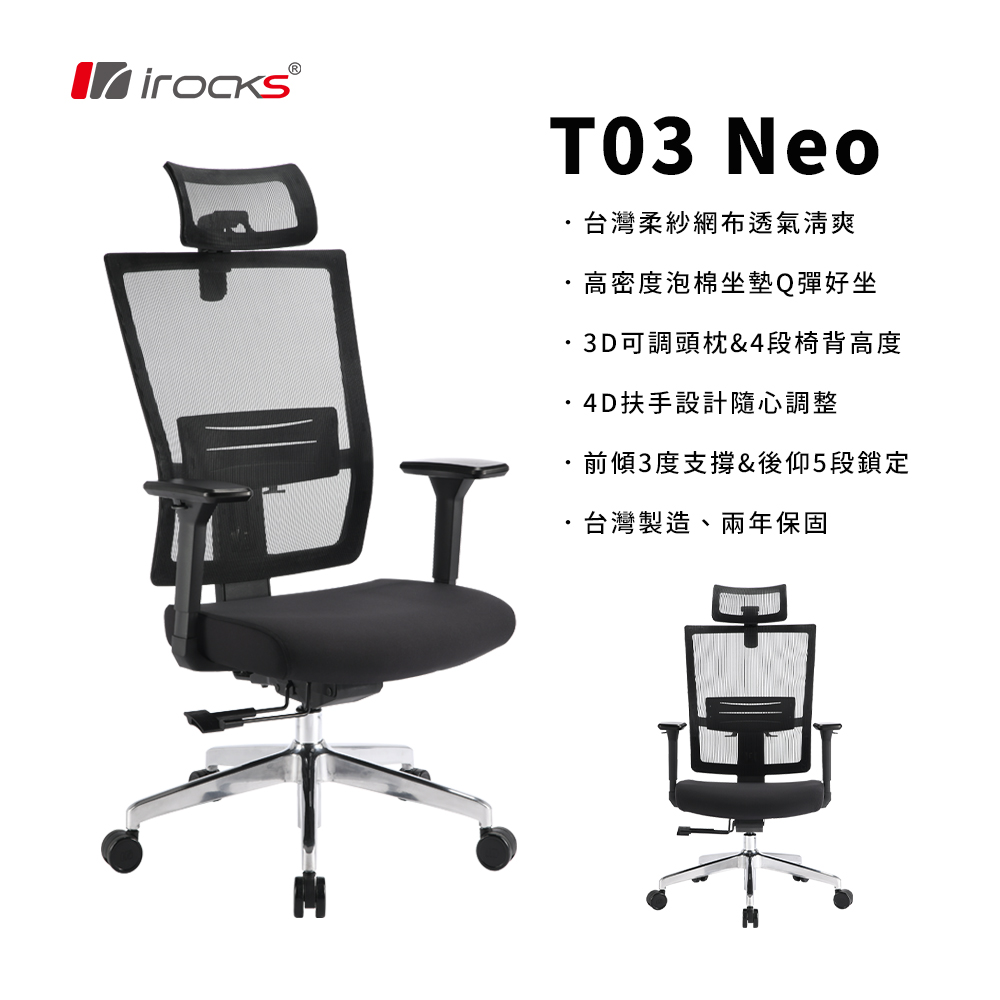 Irocks T03 Neo 電競椅(黑)/高彈力網布/4D扶手/3D可調頭枕