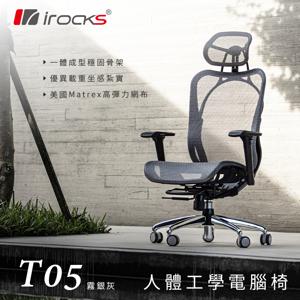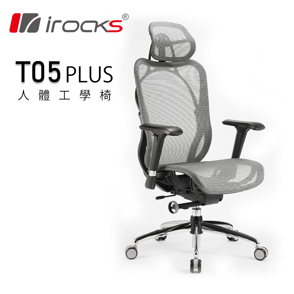 irocks T05 Plus 電競椅(灰)/人性化托盤改良/尼龍網布/可調椅背/4D/五年保