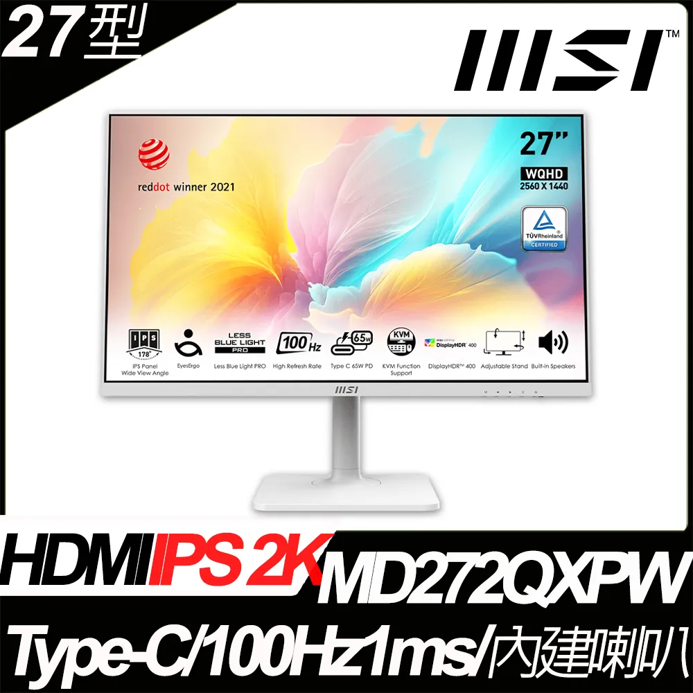 MSI Modern MD272QXPW(1H1P1C/IPS/100Hz/含喇叭/HDR400/白色)可升降旋轉顯示器
