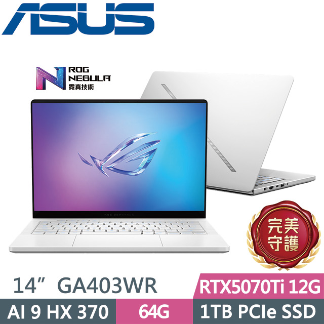 華碩 ROG Ryzen AI 9 HX/RTX5070Ti/64G/1T/14吋 鉑月銀 GA403WR-0058HHX370-NBLO