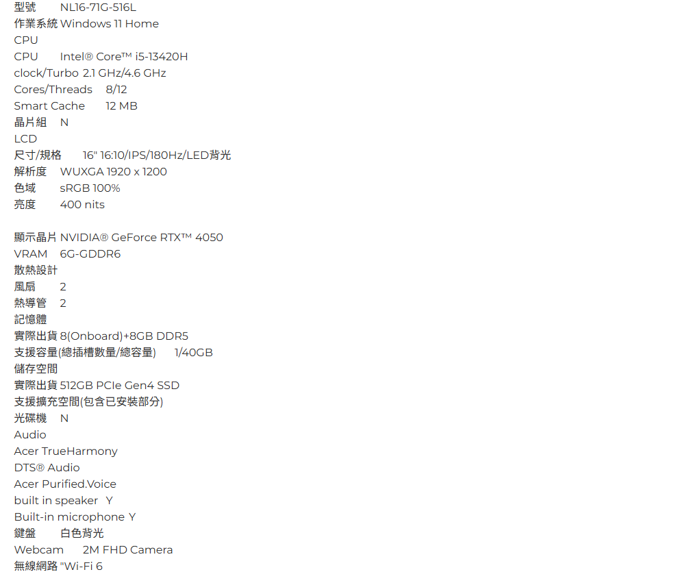 Acer Nitro Lite /i5-13420H/RTX4050/16G/512G/16吋/黑 NL16-71G-516L