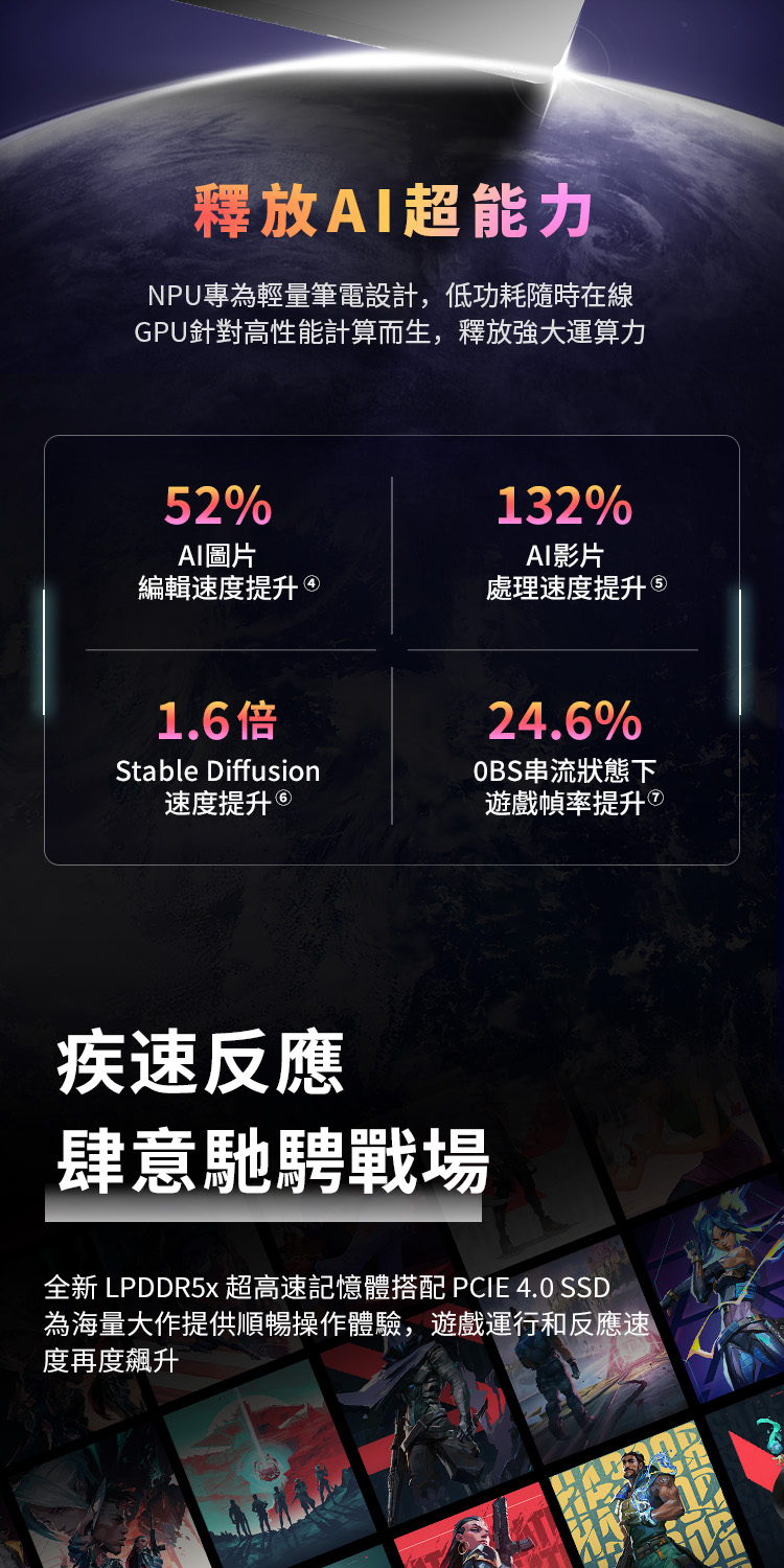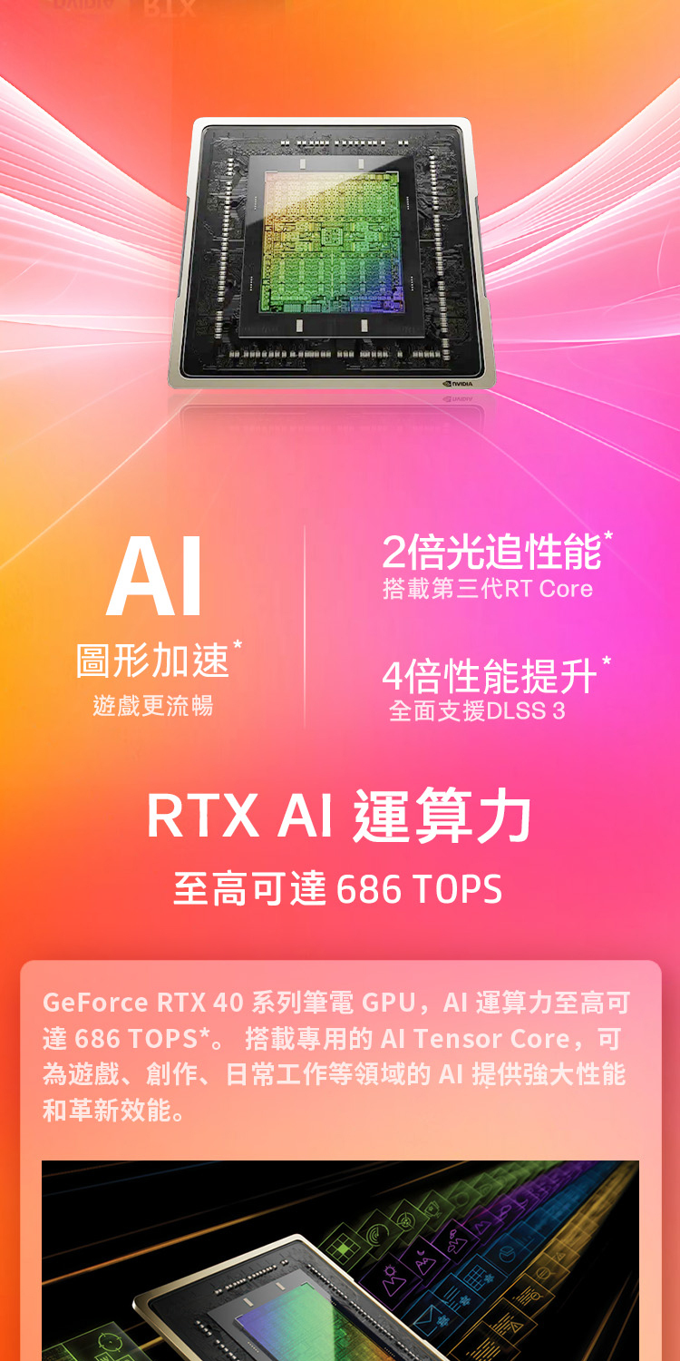 ✦ 顯示卡:繪圖晶片:獨立顯卡 Nvidia GeForce RTX 4070 8GB / Intel® Arc™ Graphics