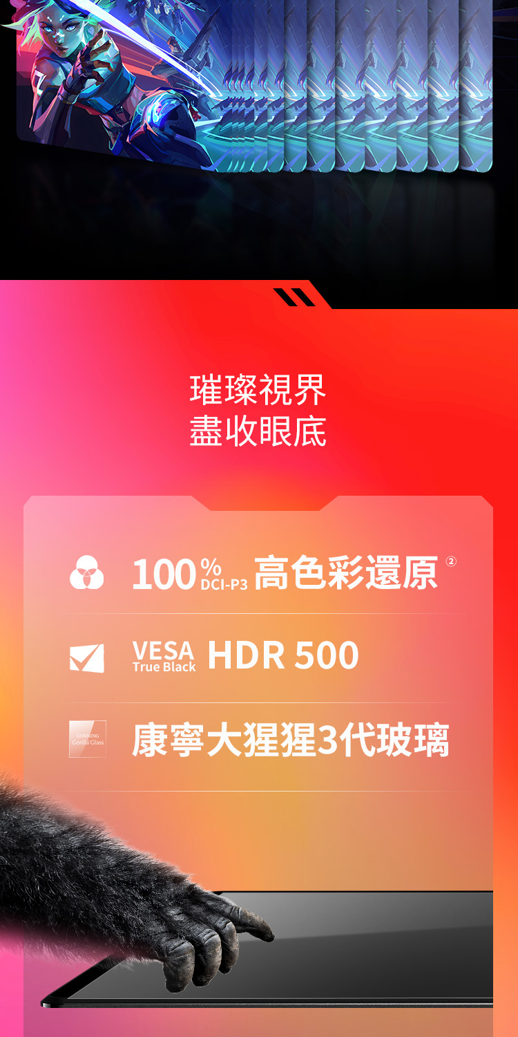 120Hz, 100% DCI-P3, SDR 400nits, HDR 500nits, 0.2ms