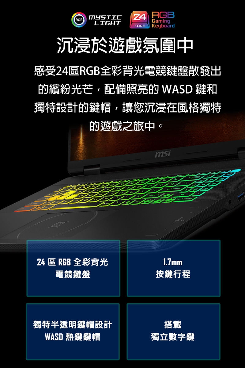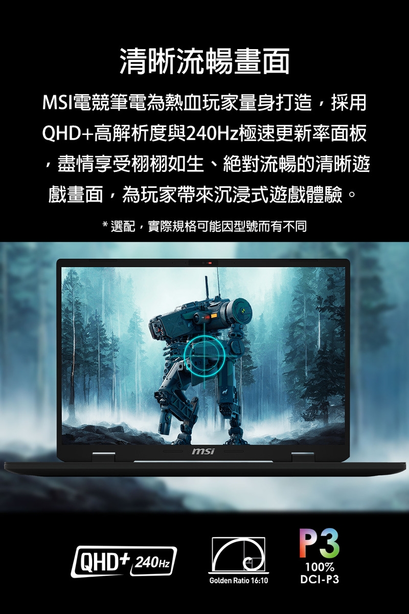 ✦ 18吋QHD+ (2560x1600), 16:10, 240Hz更新率, 100% DCI-P3, IPS等級電競面板